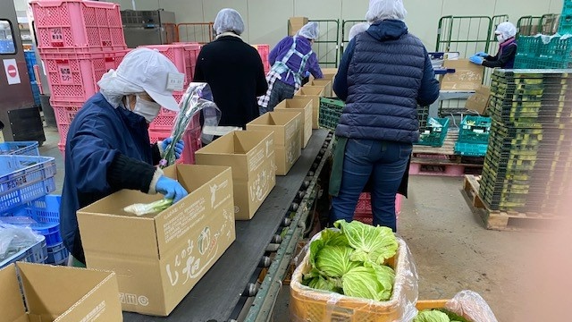 コンベアに流れているダンボールに野菜を1つずつ入れていきます